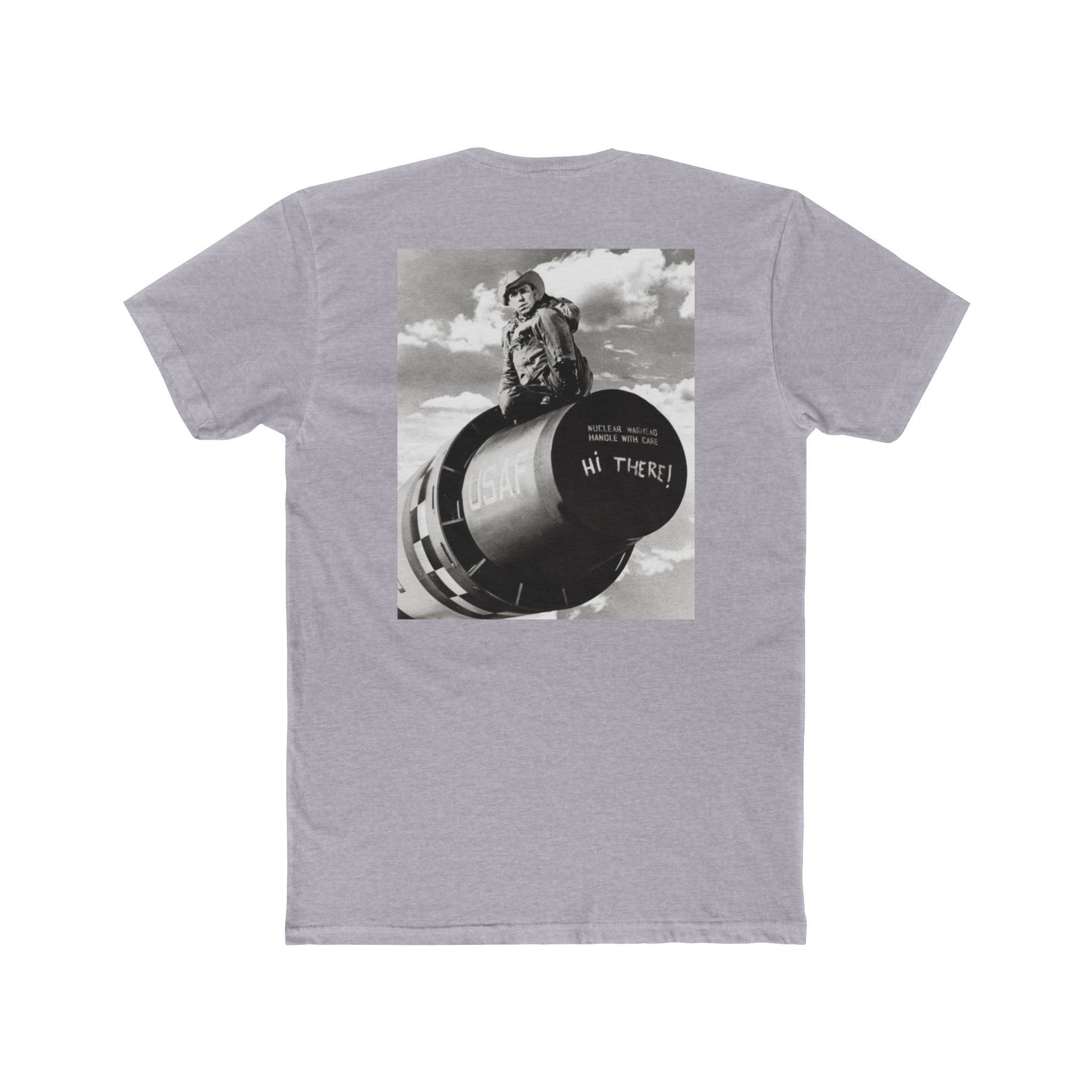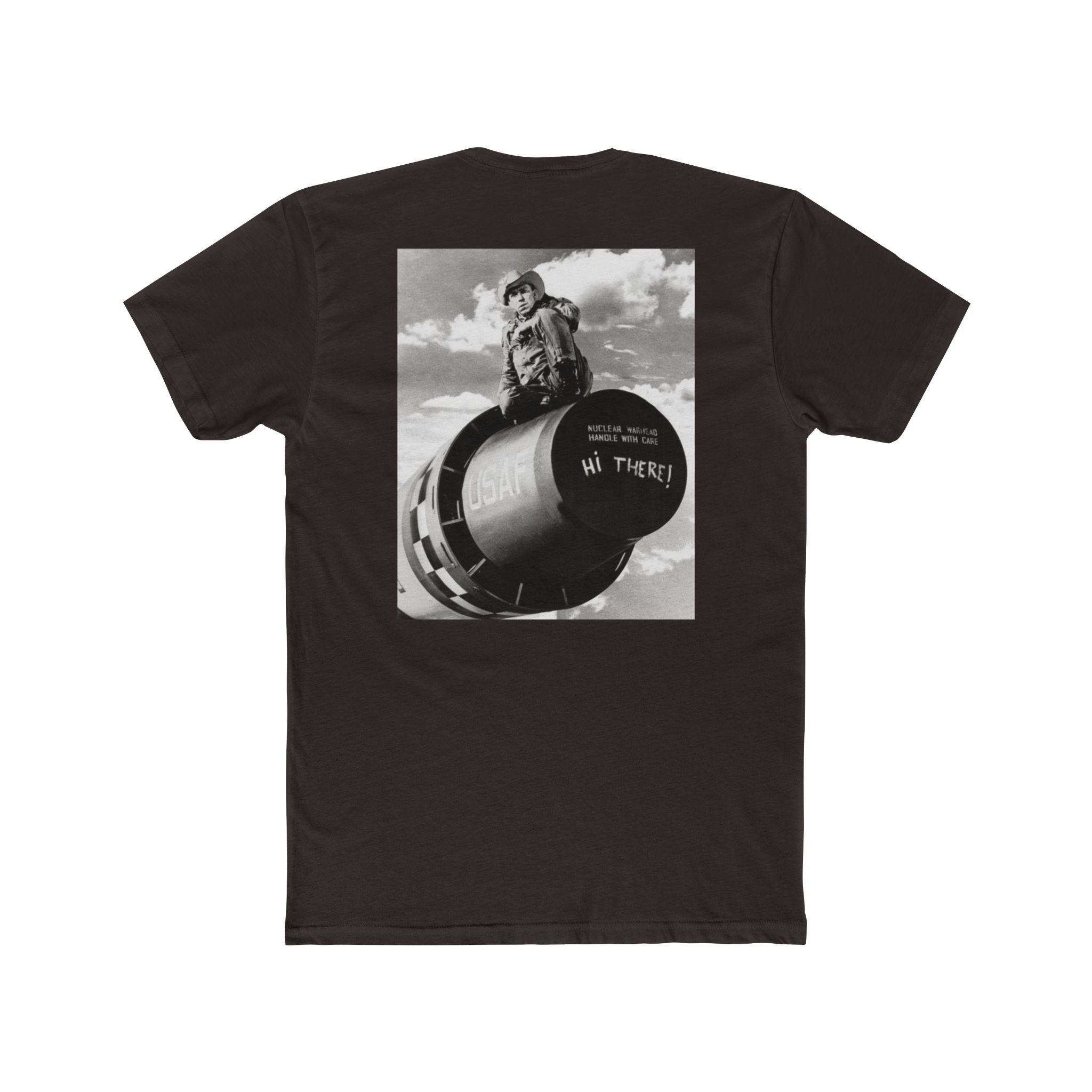 When Dr. Strangelove was released, we were at the height of the Cold War. Nobody thought that an impending nuclear holocaust was funny except Stanley Kubrick, who wrote into the storyline that Slim Pickens rides the bomb down to it's target in mother Russia. Bob thinks the irony is hilarious, so he made himself this shirt to wear... and now you can wear it too!